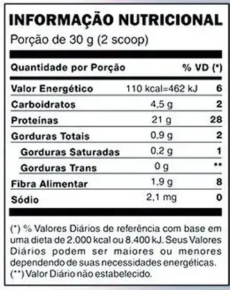 A cada porção de 46g, fornece 20g de proteína, podendo ser consumido após treinos ou ao longo do dia, conforme a necessidade individual.
