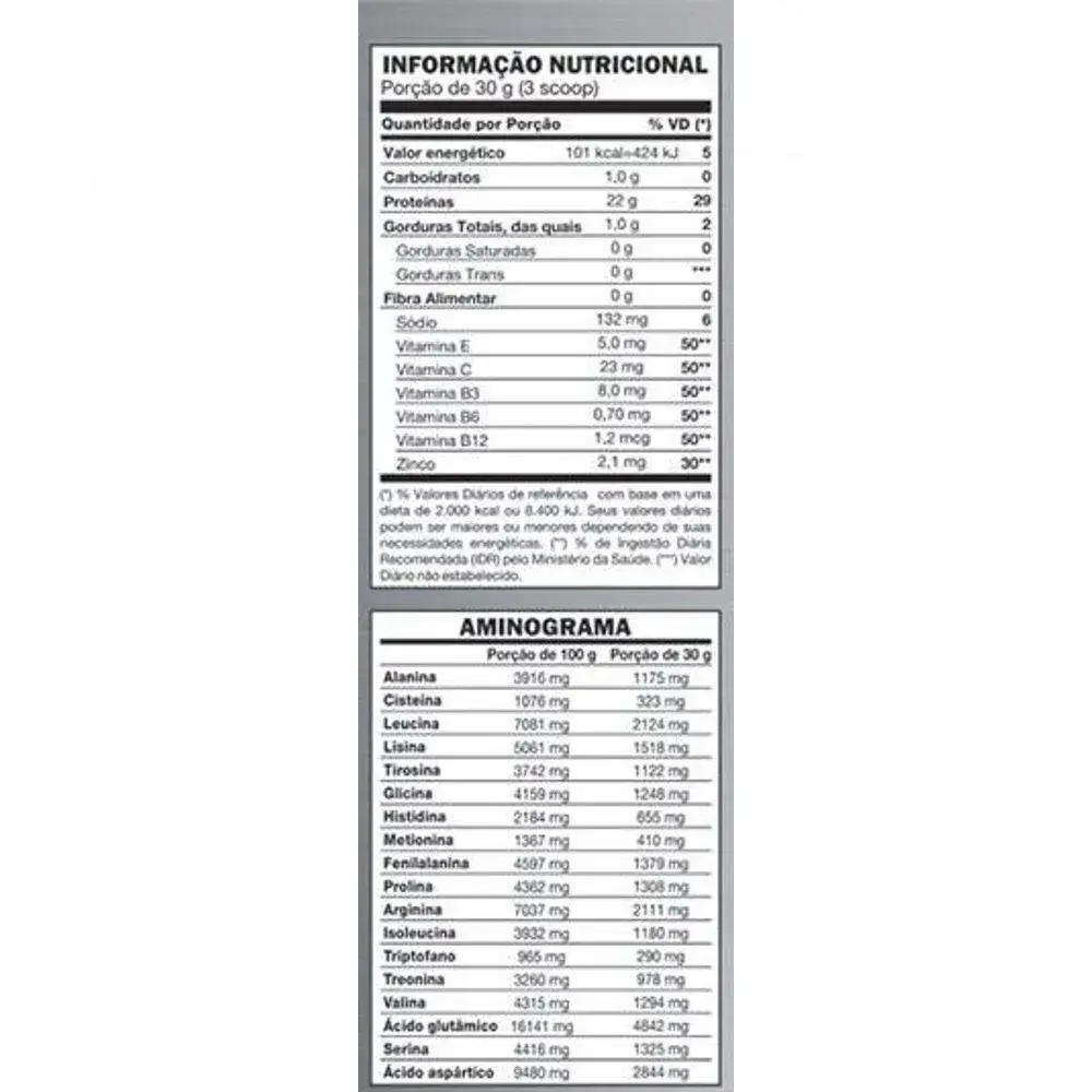 Ingredientes: proteína isolada de soja, proteína de ervilha, proteína de arroz integral, cacau em pó, farinha de beterraba, ácido ascórbico, zinco quelato, acetato de tocoferol, niacina, piridoxina, cianocobalamina, aroma idêntico ao natural de morango, aroma idêntico ao natural de baunilha, antiumectante fosfato tricálcico, edulcorantes naturais: taumatina e glicosídeos de steviol, edulcorante sucralose.